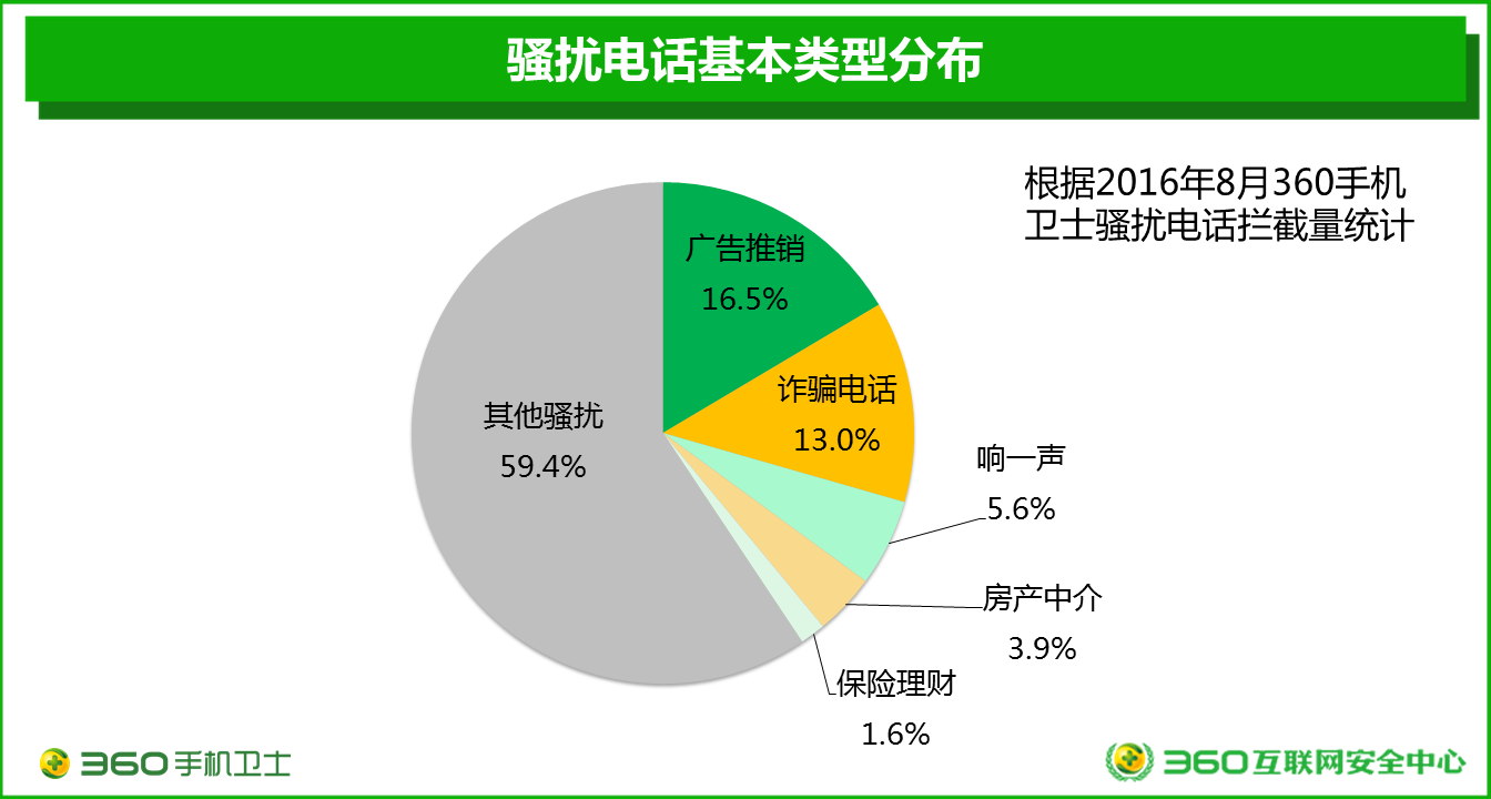 僅2016年8月,360手機衛士就為全國用戶攔截各類騷擾電話34.3億次,平均每天攔截騷擾電話約1.11億次。其中,共攔截詐騙電話4.45億次,占到了當月騷擾電話攔截總量的13.0%,平均每天攔截詐騙電話約1435萬次。考慮到詐騙電話可能給用戶帶來的經濟損失和其他嚴重后果,詐騙電話顯然已經成為危害最為嚴重的騷擾電話類型。