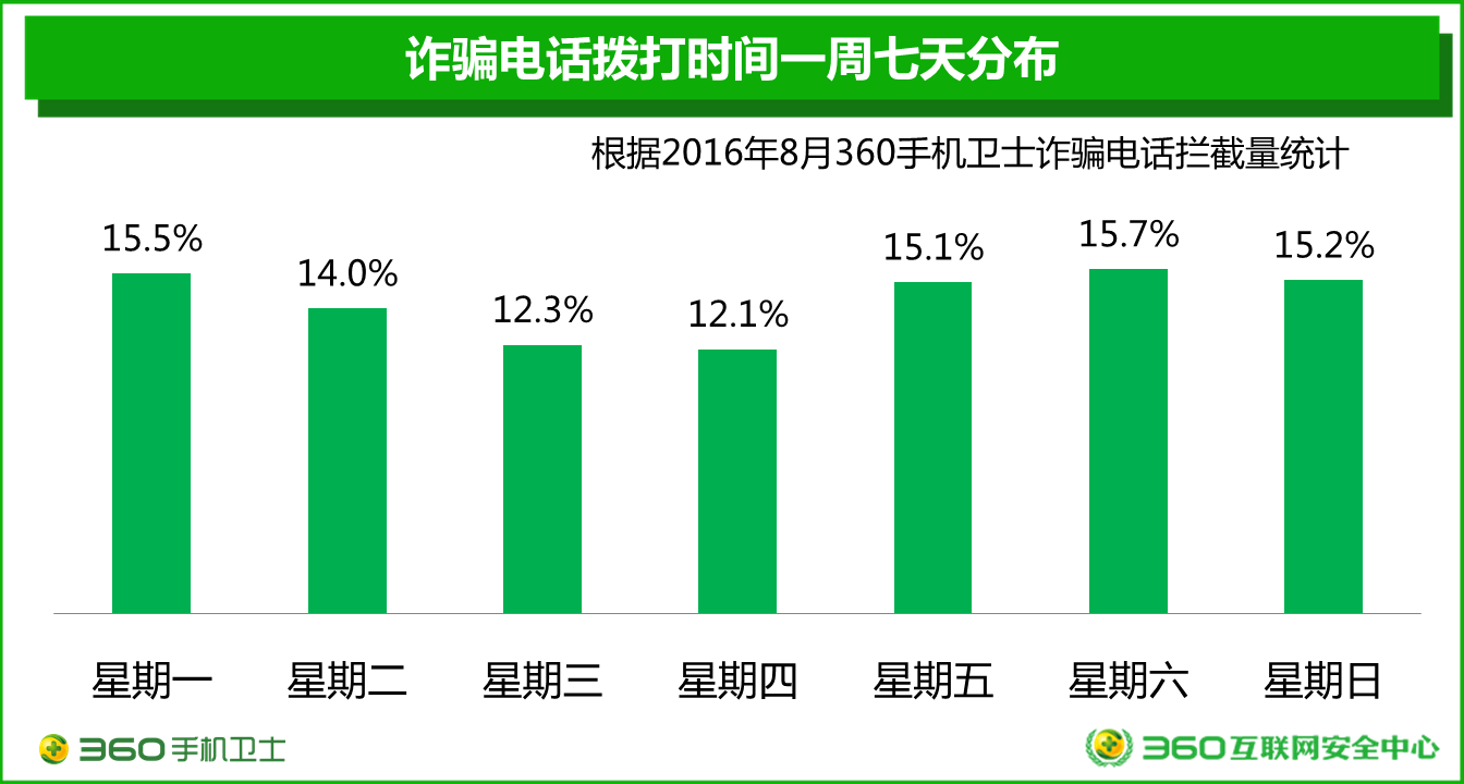 根據2016年8月360手機衛士攔截詐騙電話情況的抽樣分析顯示:每周五到下一周的周一,每天詐騙電話呼叫量均超過了一周總量的15%,而周二到周四的呼叫量則相對較低。報告認為造成這種情況的主要原因在于,周末很多人都會獨自在家,有空閑時間,而且身邊沒有可以給自己提醒的人,被騙子成功詐騙的幾率也就更高。騙子們也因此選擇在周末來撥打更多的詐騙電話。