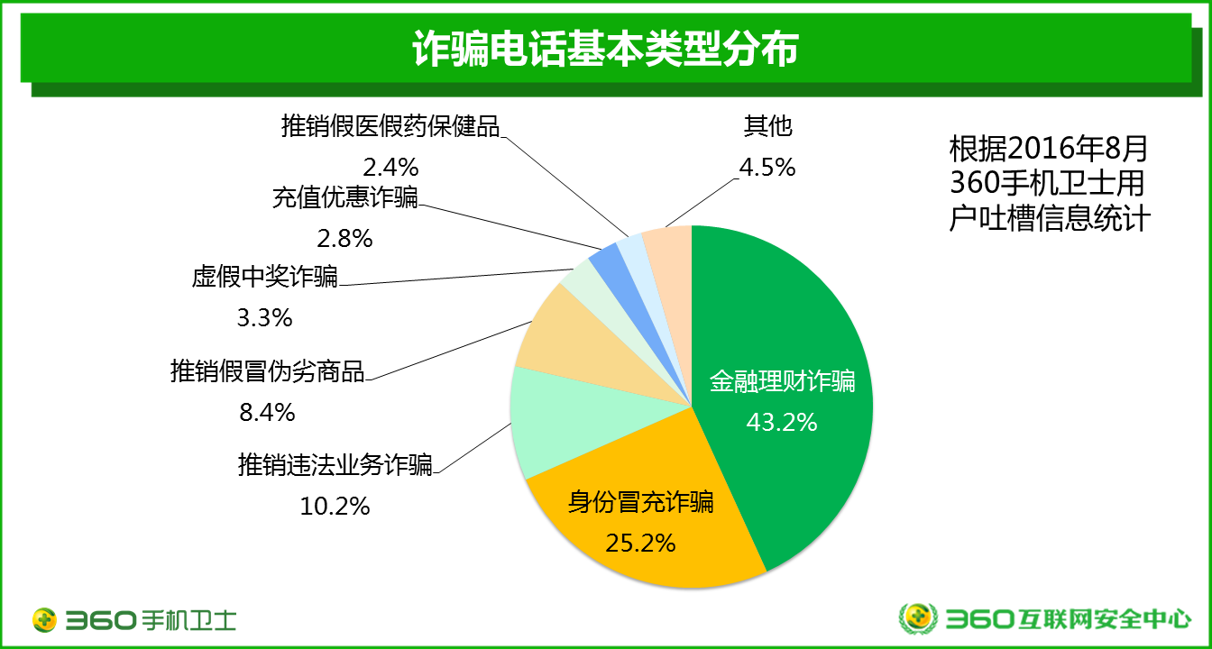 根據2016年8月360手機衛士用戶的“吐槽信息”的統計分析顯示,在用戶接到所有的詐騙電話中,虛假的金融理財詐騙最多,占43.2%,此類詐騙在北上廣深等大城市尤其盛行;其次是身份冒充詐騙,占25.2%。兩類詐騙相加占比68.4%。在身份冒充類詐騙中,冒充電信運營商的詐騙數量最多,占比為26.0%;其次是冒充領導,占21.2%;排名第三的是冒充快遞,占14.3%。